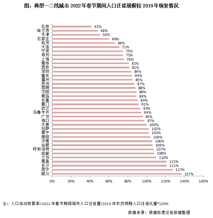 2022年春節是疫情影響下的第三個春節,在國家精準防疫策略下,2022年春節流動人口規模較2021年大幅增加,全國總人口遷徙規模已經恢復至疫情前(2019年春節)的九成。但由于各地政策、流動人口數量本身存在較大差異,各地人口遷徙規模恢復水平各不相同。考慮到人口遷徙恢復情況一定程度上代表著該地的經濟復蘇水平,與其潛在的購房需求與能力呈現正相關,因此研究各城市春節人口遷徙尤為必要。