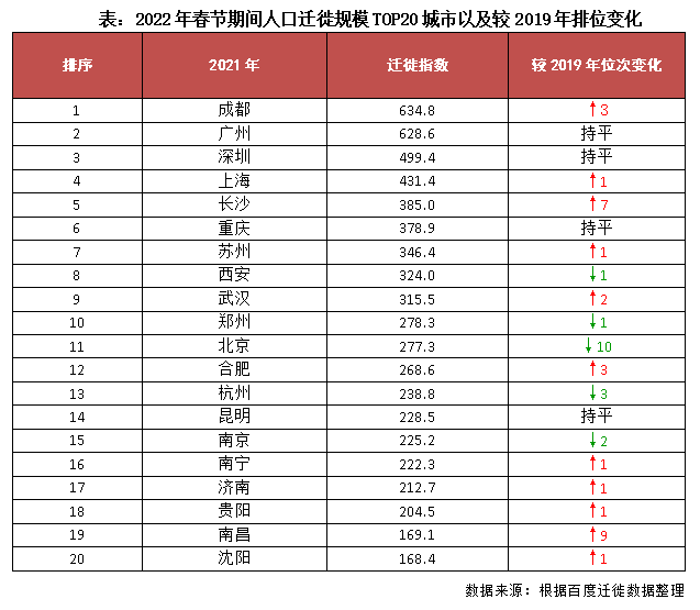 分城市來看,成都替代北京(2019、2020年榜首)和廣州(2021年榜首),成為2022年春節期間人口遷徙總量榜首城市。原因當然是多方面的,一是由于成都人口規模巨大,并且近些年人口增量也十分突出,加之西南地區疫情相對比較穩定,返鄉人口規模巨大也在意料之中,另一方面成都擁有豐富的自然、人文景觀,出游人群規模也十分巨大,因此2022年春節成都人口遷徙規模躍居全國第一。長沙、南昌也與成都類似,遷徙規模排序較疫情前均明顯提升,分別提升至了7和9個位次。