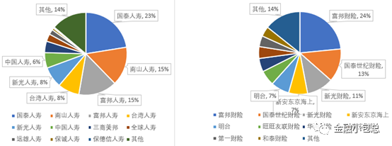 截止2018年底,臺(tái)灣地區(qū)一共有55家保險(xiǎn)公司,其中再保險(xiǎn)公司3家、壽險(xiǎn)公司29家、財(cái)險(xiǎn)公司23家。從保費(fèi)收入來看國(guó)泰人壽、新光人壽、富邦人壽、南山人壽、臺(tái)灣地區(qū)人壽這前五大壽險(xiǎn)公司占據(jù)了70%的市場(chǎng)份額,其中有4家為金控集團(tuán)旗下壽險(xiǎn)品牌,而市占率不到百分之一的壽險(xiǎn)有9家。財(cái)險(xiǎn)方面,富邦、國(guó)泰世紀(jì)和新光三家金控集團(tuán)下的財(cái)險(xiǎn)公司占據(jù)了整個(gè)市場(chǎng)的46.98%。