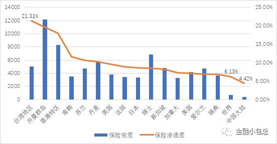 圖四:世界主要國(guó)家和地區(qū)的保險(xiǎn)密度和滲透度