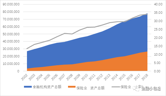 受益于保費(fèi)規(guī)模的超高速增長(zhǎng),臺(tái)灣地區(qū)保險(xiǎn)公司也成為金融細(xì)分領(lǐng)域中成長(zhǎng)性最快的子板塊,臺(tái)灣地區(qū)保險(xiǎn)公司總資產(chǎn)占全部金融機(jī)構(gòu)總資產(chǎn)比重從2002年的16%提高到2018年34.14%。