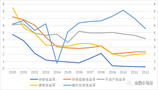 70年代到90年代是臺(tái)灣地區(qū)經(jīng)濟(jì)高速增長(zhǎng)和經(jīng)濟(jì)轉(zhuǎn)型的時(shí)期,經(jīng)濟(jì)增速較快,因而房地產(chǎn)相對(duì)收益率較高,但是90年代初股災(zāi)和房地產(chǎn)泡沫破滅后,臺(tái)灣地區(qū)房地產(chǎn)進(jìn)入了有價(jià)無市的陰跌狀態(tài)。到2010年后,臺(tái)北市的寫字樓收益率也跌到只剩下2%。以國(guó)泰人壽為例,不動(dòng)產(chǎn)投資的收益率從2000年的6.14%下降到2012年的4.16%。