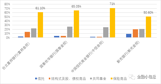 臺(tái)灣地區(qū)金融機(jī)構(gòu)目前以“金控”體系為主,一個(gè)金控集團(tuán)旗下囊括了銀行、保險(xiǎn)、證券期貨和基金公司。金控體系下各個(gè)金融子板塊之間往往從考核機(jī)制上被要求要相互協(xié)作,因而金控下的銀行財(cái)富管理部門有意識(shí)引導(dǎo)民眾購(gòu)買保單。