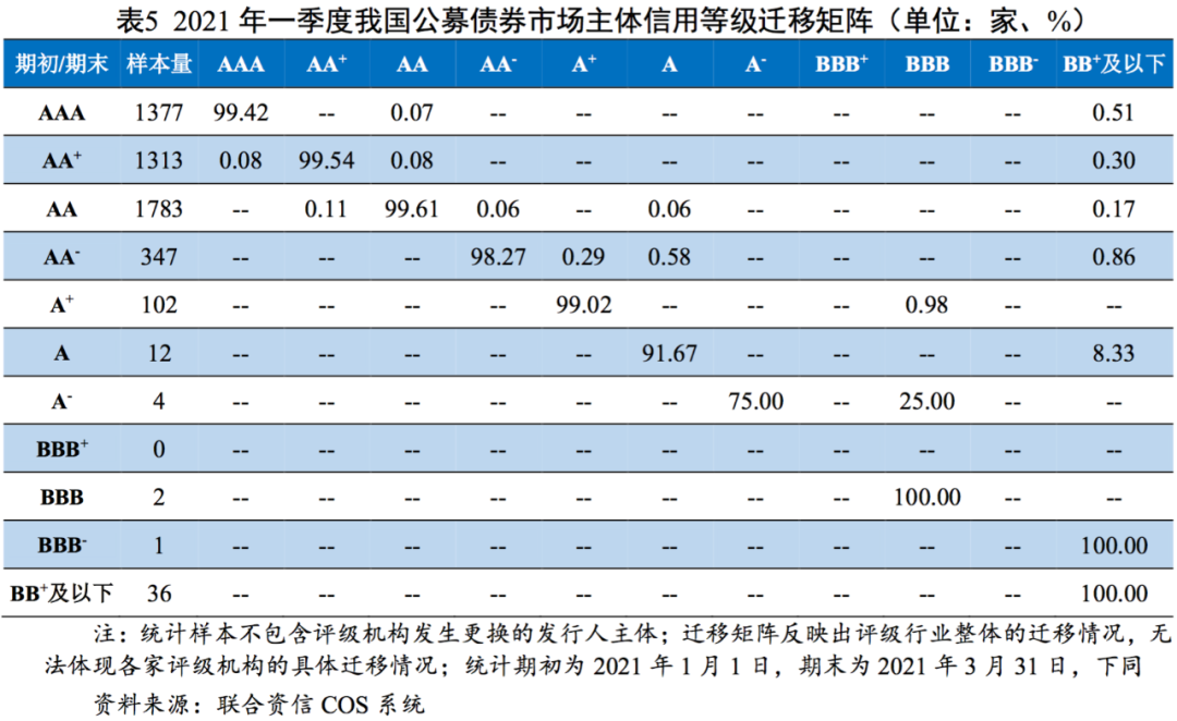 2021年一季度,我國公募債券市場多數發行人和債券尚未進入評級跟蹤期,發行主體信用等級遷移數量相對較少,評級穩定性整體較高。從信用等級遷移方向來看,樣本數量較多的A+級及以上級別均呈現向下遷移趨勢。