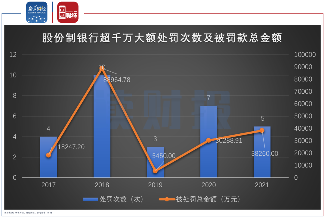 在收罰單總數量及被罰款金額均增長的前提下,股份制銀行單張被罰款金額超過1000萬元的罰單,由2020年的7張降至2021年的5張,但被罰款總額由2020年的3.03億元增至3.83億元;民生銀行、華夏銀行、招商銀行、浦發銀行和中信銀行各占1起,其中有4張為金額超過5000萬元的“巨額罰單”。