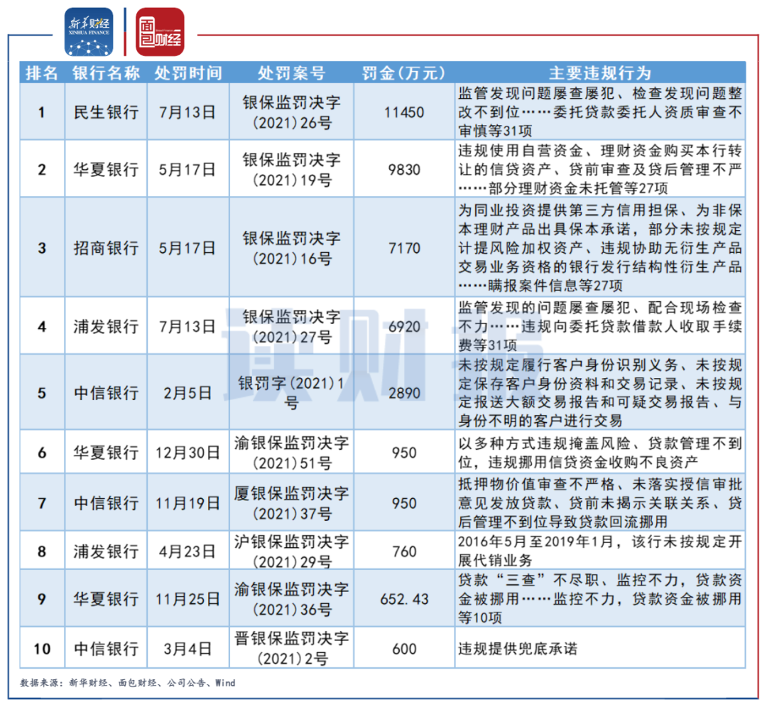 5000萬元以上巨額罰單:民生、華夏、招行、浦發各領一張