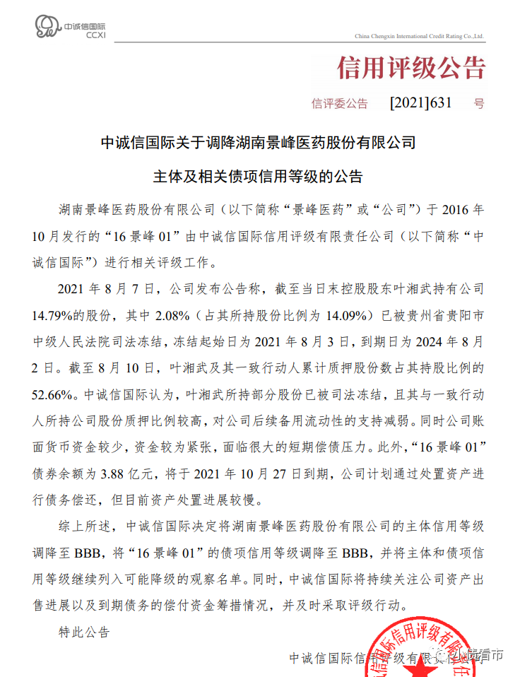 8月17日,中誠信國際公告稱,決定將景峰醫藥(000908.SZ)主體和“16景峰01”的債項信用等級由“A”調降至“BBB”,并列入可能降級的觀察名單。