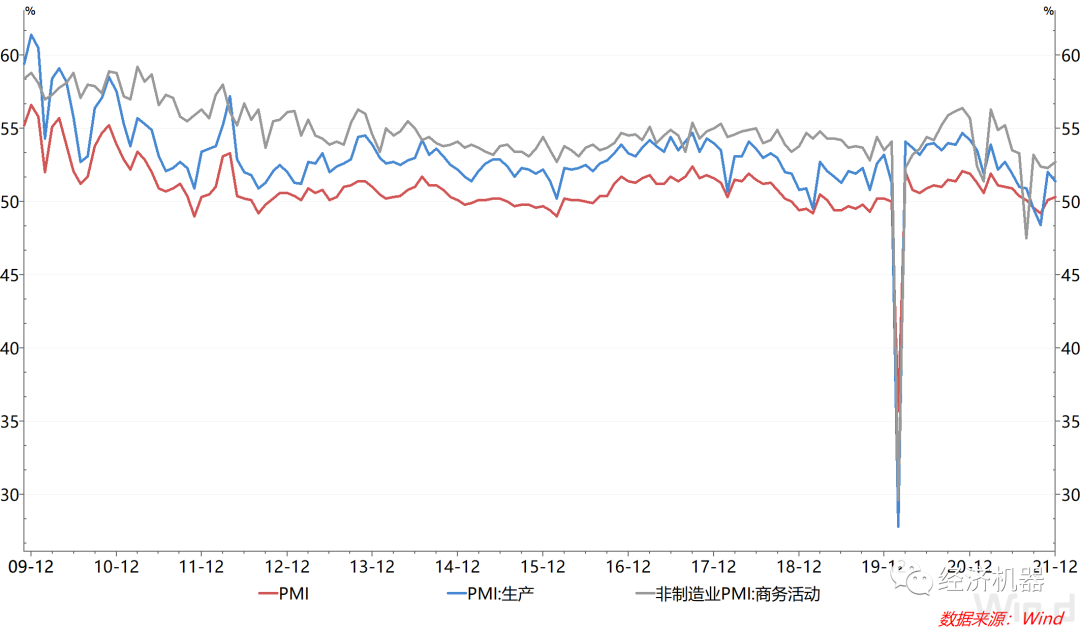 1)制造業(yè)生產(chǎn)動能放緩,非制造業(yè)逆勢復(fù)蘇。12月,PMI整體繼續(xù)回升,但生產(chǎn)分項指數(shù)為51.4%,較上月的52%回落0.6個百分點,表明制造業(yè)生產(chǎn)景氣擴張趨緩,可能是由于因限產(chǎn)限電積壓的訂單在上月已基本完成,當前生產(chǎn)已基本恢復(fù)常態(tài)。非制造業(yè)商務(wù)活動指數(shù)在11月微跌后,于12月回升了0.4個百分點,至52.7%。這在12月疫情外溢蔓延的情況下是難能可貴的,對經(jīng)濟穩(wěn)定運行提供了重要支持(圖1)。