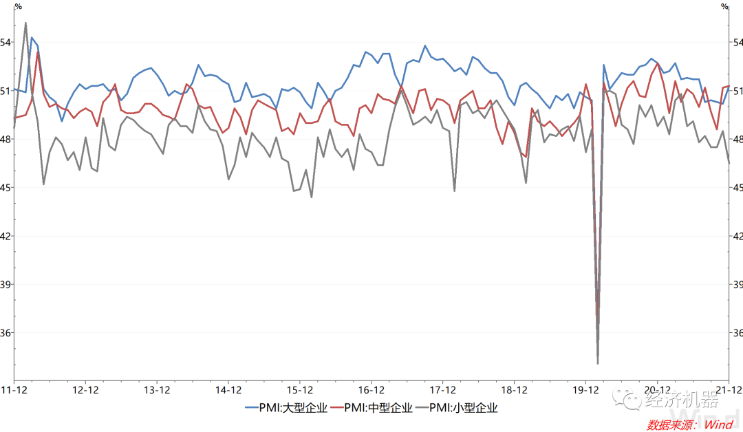 2)大型企業(yè)景氣度提升,小型企業(yè)景氣度放緩顯著。12月,大中小型企業(yè)依舊呈分化態(tài)勢,與11月不同的是,12月大型企業(yè)恢復(fù)較好,小型企業(yè)景氣度惡化。其中,大型企業(yè)PMI為51.3%,較上月提升1.1個百分點;中型企業(yè)PMI與上月基本持平,維持在擴張區(qū)間;小型企業(yè)PMI為46.5%,較上月回落2個百分點(圖2)。這表明,在疫情反復(fù)的當下,中小企業(yè)仍面臨極大經(jīng)營困境,需要在政策上提供更有力的支持,這與12月中旬國常會繼續(xù)部署加大中小微企業(yè)支持力度是一致的。