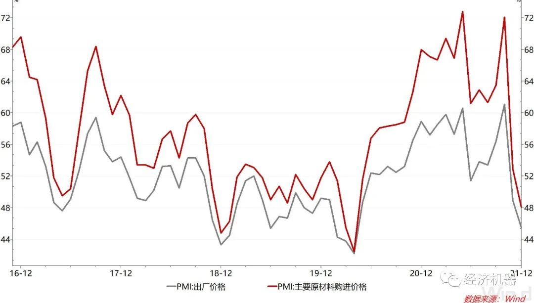 3)工業(yè)生產(chǎn)領(lǐng)域價格繼續(xù)回落,降幅收窄,原材料價格走勢開始分化。12月,PMI主要原材料購進價格指數(shù)和出廠價格指數(shù)分別為48.1%和45.5%,較上月繼續(xù)回落,分別下行4.8和3.4個百分點,降幅有所收窄(圖3)。