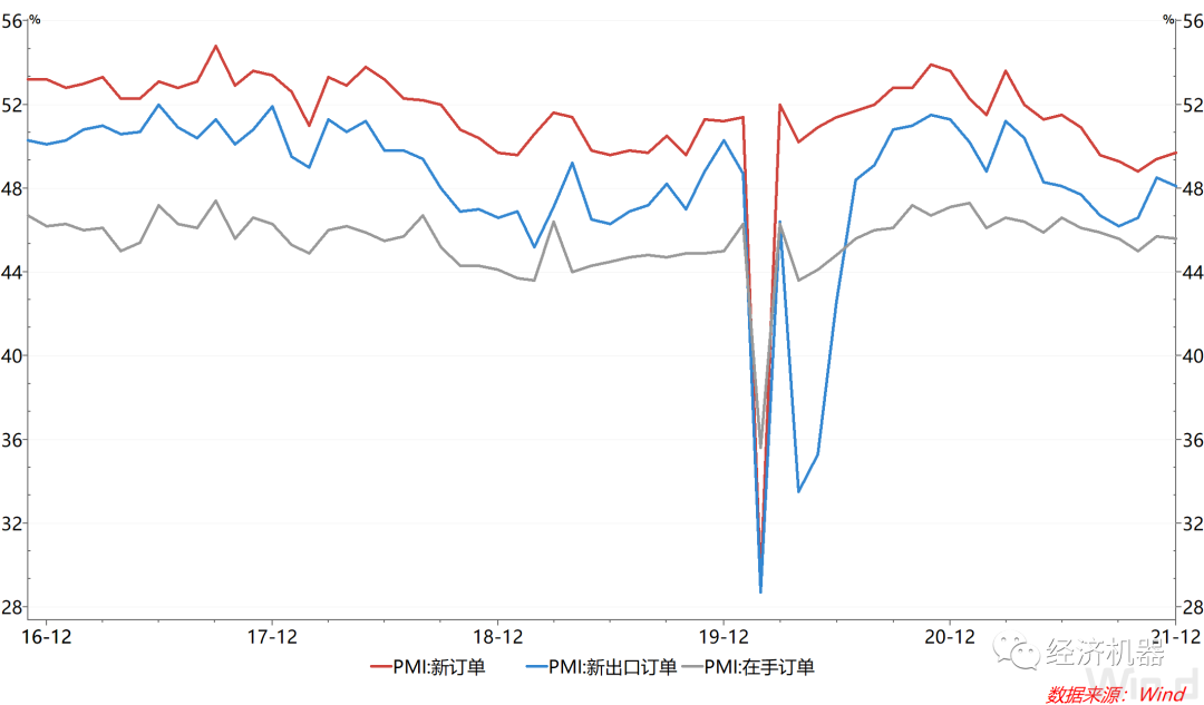 4)新訂單繼續(xù)改善,在手訂單出現(xiàn)回落。12月,PMI新訂單指數(shù)為49.7%,較上月回升0.3個百分點,繼續(xù)改善。其中,新出口訂單為48.1%,較上月回落0.4個百分點,說明國內(nèi)新訂單改善會更強一些。在手訂單指數(shù)45.6%,較上月回落0.1個百分點。這可能是由于生產(chǎn)的逐步正常化,積壓的訂單已經(jīng)逐步消化完成,但也從一定上說明新訂單增長并不強勁(圖5)。
