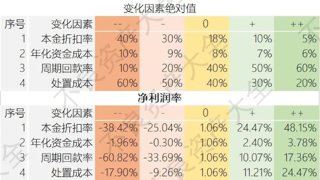 這里要注意的是,對銀行個貸不良而言,無論是催收還是代理訴訟都有比較成熟的市場,因此對于不同賬齡和質量的銀行不良資產包,其處置成本都有較為固定的市場價格。表5-1中將處置成本也作為變化因素做敏感性分析,主要原因其一是以目前一級市場成交情況來看,標的質量參差不齊。其次是不同資產管理公司自行處置對于處置成本的把控也不盡相同。