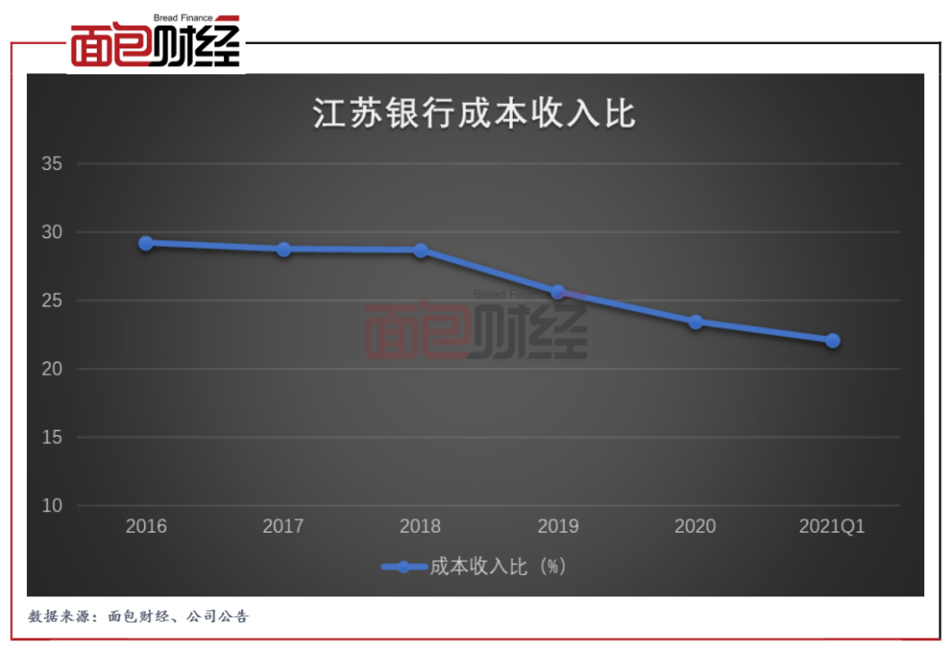 凈利潤的增幅擴大與江蘇銀行成本收入比持續(xù)降低有關(guān)。數(shù)據(jù)顯示,截至2021年一季度,該行的收入成本比為22.12%,較上年末減少1.34個百分點。
