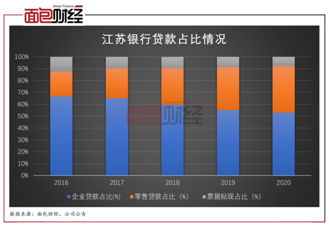 資產(chǎn)負債規(guī)模增長的同時,江蘇銀行的資產(chǎn)結(jié)構(gòu)也在不斷優(yōu)化。截至2020年末,貸款在總資產(chǎn)中的占比超過51%,較上年增加1.01個百分點,占比連續(xù)五年提升。