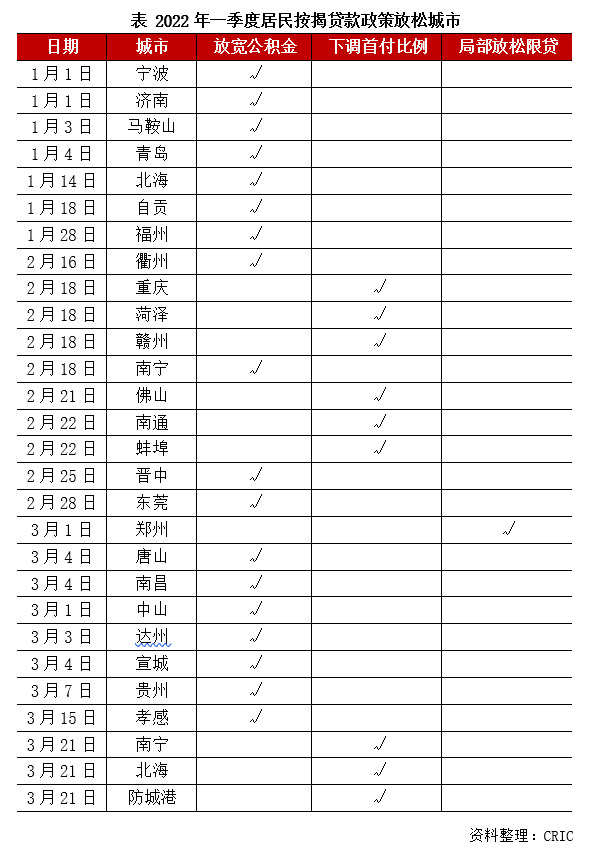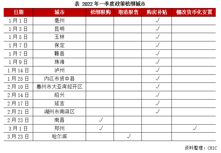 2022年一季度,中央多部委密集表態(tài)穩(wěn)地產(chǎn),財政部明確今年內(nèi)不具備擴(kuò)大房地產(chǎn)稅改革試點城市的條件,兩會定調(diào)探索行業(yè)新發(fā)展模式,支持新市民等三類購房需求。房企融資、預(yù)售資金監(jiān)管適度松綁,并購貸不計入“三道紅線”、保障性租賃住房貸款不計入“兩道紅線”、全國性商品房預(yù)售資金監(jiān)督管理辦法出臺。居民按揭貸款政策邊際改善,各地放寬公積金貸款、下調(diào)首付比例、局部放松限貸、下調(diào)房貸利率。15城出臺新政刺激購房需求,重點涉及松綁限購、取消限售、發(fā)布購房補(bǔ)貼、棚改貨幣化安置等。