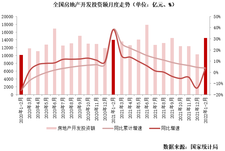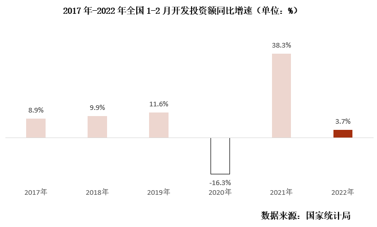 據(jù)國家統(tǒng)計局?jǐn)?shù)據(jù):1—2月,全國房地產(chǎn)開發(fā)投資14499億元,同比增長3.7%。對比往年同期來看為近6年次低,僅高于2020年。