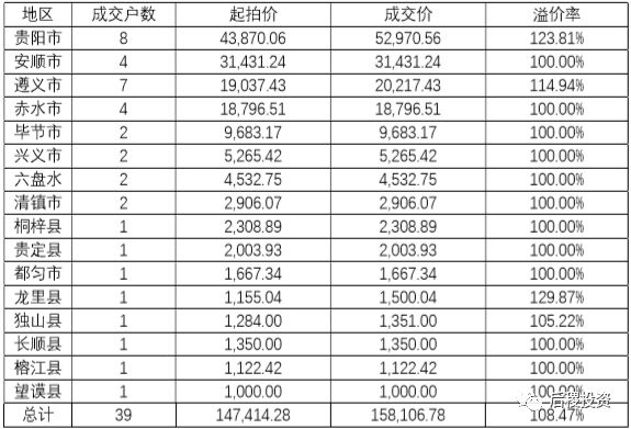 從成交戶數上分析,貴陽市、安順市、遵義市相對交易較為活躍,其中貴陽市溢價率最高,拍品質量相對最好。