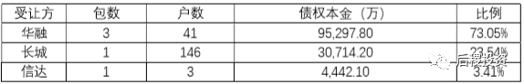 2017 年華融收包最多,占比73%,長城次之,占比23%。