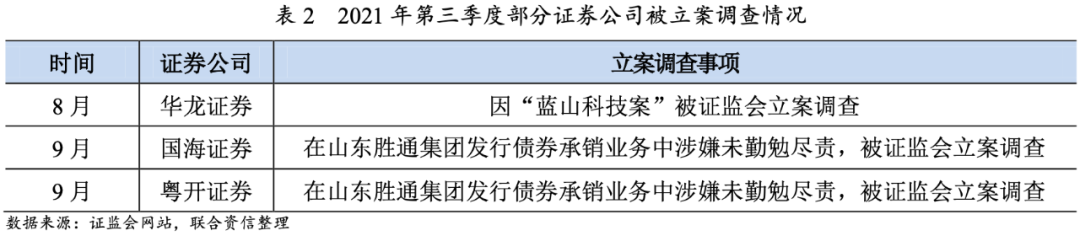 2021年第三季度,華龍證券、國海證券、粵開證券等證券公司因投行業務中未勤勉盡責等原因被證監會立案調查,證券公司監管處罰頻次較2季度有所減少,多家證券公司因營業部內控等問題受到監管措施。