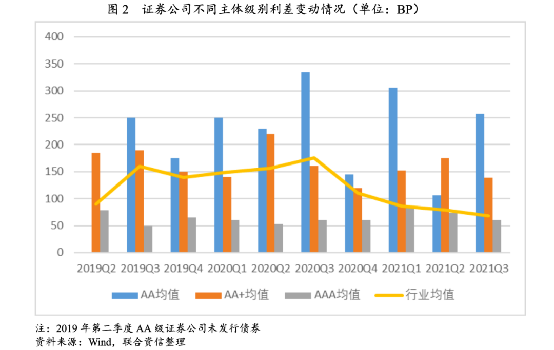 2021年第三季度,證券公司發行利差有所收窄,其中主體評級為AAA和AA+證券公司發行利差均值降幅較大,AA級證券公司利差均值有所上升;行業利差均值68.34BP,環比下降10.99BP;AAA證券公司平均利差低于AA+利差78.76BP,差額環比下降21.97BP。