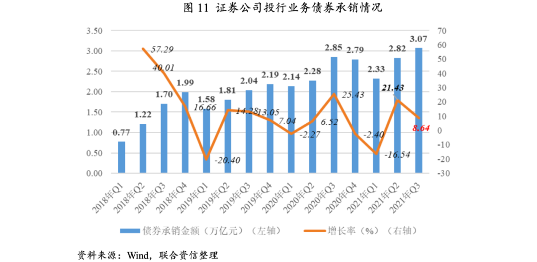 證券公司債券承銷規模同比、環比均有一定幅度增長。2021年三季度,證券公司各類債券承銷金額3.07萬億元,同比增長7.45%,環比增長8.64%。