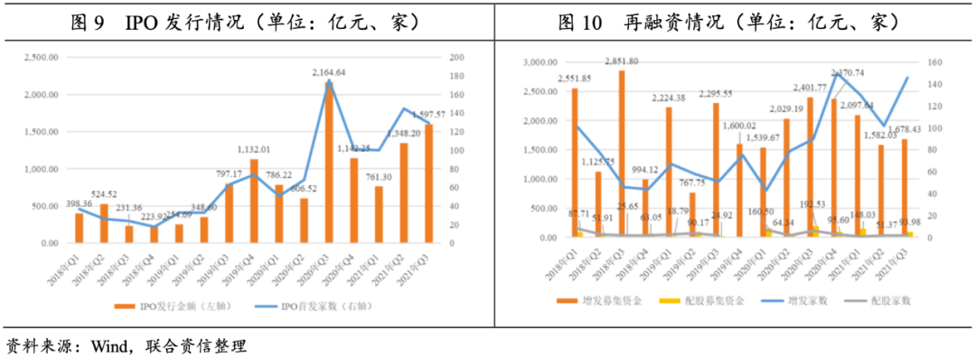IPO發行和增發金額穩步增加,股權項目募資規模環比小幅增長。2021年三季度,各類股權類項目募資總額環比增長3.56%,主要系IPO發行金額和增發募集資金規模的增長(分別環比增長18.50%和6.09%)。IPO和增發仍為股權類項目募集資金的主要方式,2021年三季度,通過上述兩種方式募集資金的金額分別1597.57億元和1678.43億元,占募資總額的比重分別為38.45%和40.39%。
