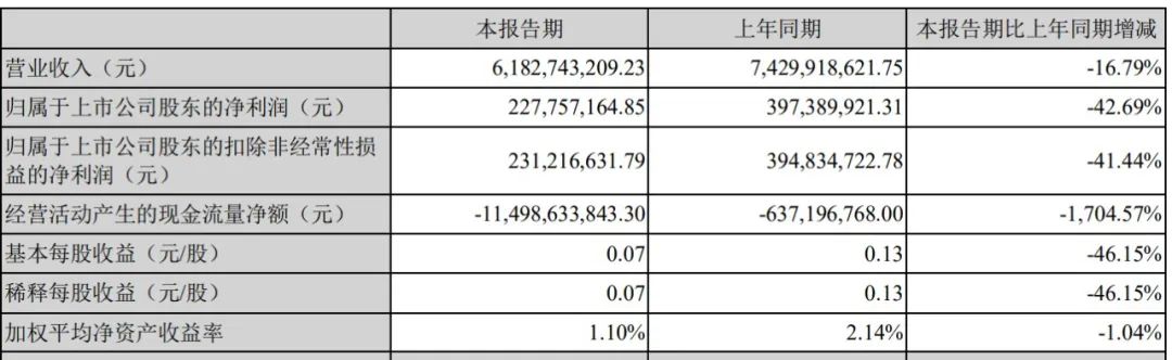 和2021年數(shù)據(jù)正相反,2022年1季度濱江集團(tuán)的營(yíng)收和凈利潤(rùn)同比均呈下跌狀態(tài)。如下圖,營(yíng)收同比下降16.79%,為61.83億元;歸屬于上市公司股東的凈利潤(rùn)同比下降42.69%,為2.28億元。經(jīng)營(yíng)活動(dòng)產(chǎn)生的現(xiàn)金流量?jī)纛~同比大跌1704.57%,為-115.0億元。