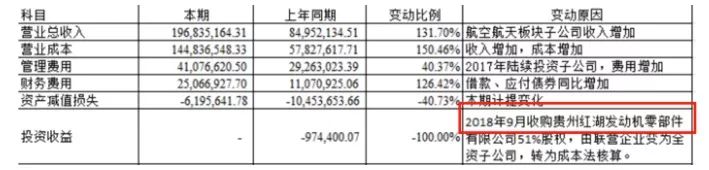 在公司2018年一季報中,公司在解釋投資收益變動原因時提到:“2018年9月收購貴州紅湖發動機有限公司51%股權,由聯營企業變為全資子公司,轉為成本法核算”,以下為財報截圖: