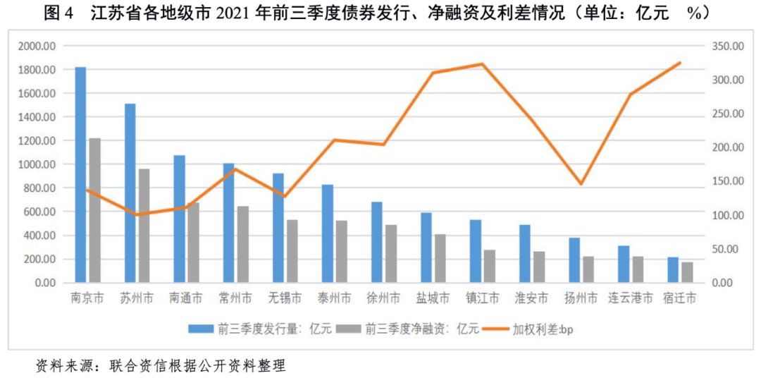 江蘇省城投債發(fā)行及存續(xù)規(guī)模大,主要集中于蘇南地區(qū),南京市新發(fā)及存續(xù)規(guī)模最大,宿遷市最??;存續(xù)債券信用等級(jí)整體以高等級(jí)為主,蘇南地區(qū)存續(xù)城投債信用等級(jí)整體高于蘇中及蘇北地區(qū),徐州、揚(yáng)州及宿遷市存續(xù)債以AA級(jí)為主;存續(xù)債券行政層級(jí)以較低的區(qū)縣及園區(qū)級(jí)為主,蘇南地區(qū)存續(xù)城投債行政層級(jí)下沉程度整體大于蘇中及蘇北地區(qū)。蘇南地區(qū)城投債發(fā)行成本優(yōu)勢(shì)明顯好于蘇北地區(qū),宿遷市、鎮(zhèn)江市和鹽城市發(fā)債成本省內(nèi)相對(duì)較高。2021年前三季度,江蘇省各地市債券凈融資規(guī)模均為正,宿遷市、連云港市和揚(yáng)州市債券凈流入規(guī)模偏低。