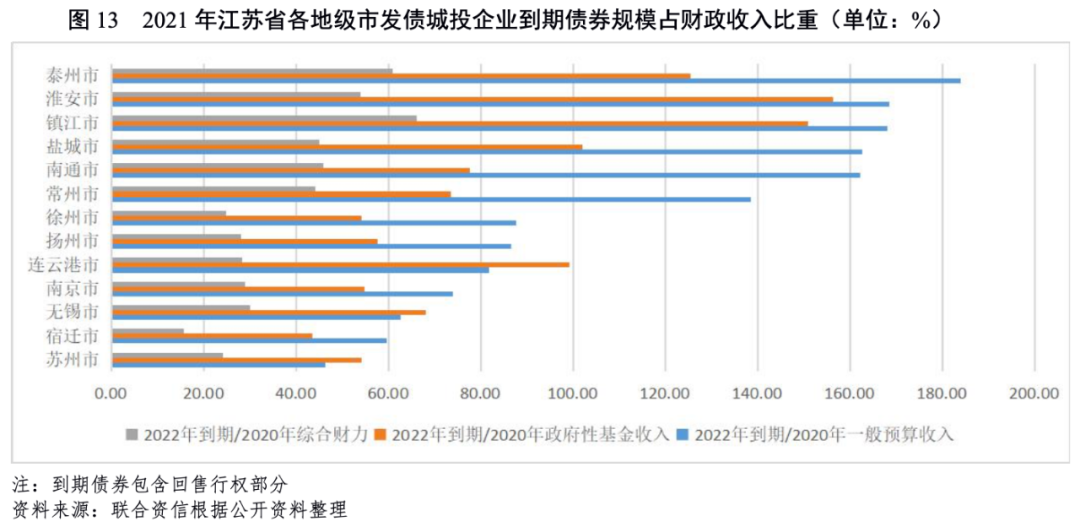 我們以城投企業(yè)2022年到期債券規(guī)模占一般公共預(yù)算收入或政府性基金收入的比重來(lái)衡量一般公共預(yù)算收入或政府性基金收入對(duì)到期債券的覆蓋情況,償債能力偏弱的城市為泰州市、淮安市和鎮(zhèn)江市;以城投企業(yè)2022年到期債券占2020年地方政府綜合財(cái)力的比重來(lái)近似衡量2022年城投債券的到期償還能力,泰州市、鎮(zhèn)江市和淮安市城投企業(yè)2022年到期債券占地方政府綜合財(cái)力的占比分別為60.86%、66.17%和53.92%??傮w看,泰州市、鎮(zhèn)江市和淮安市城投企業(yè)2022年到期債券的償還能力偏弱。