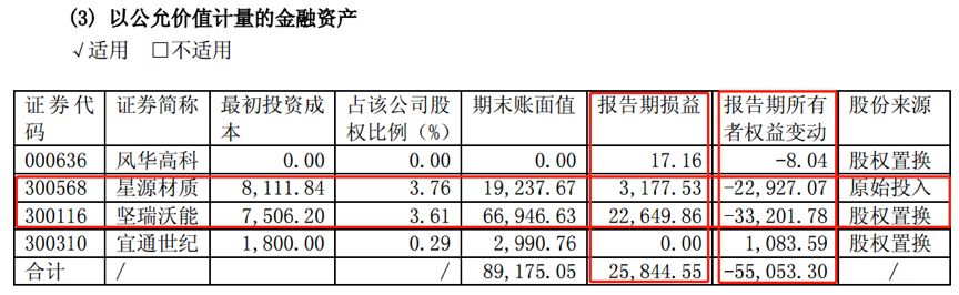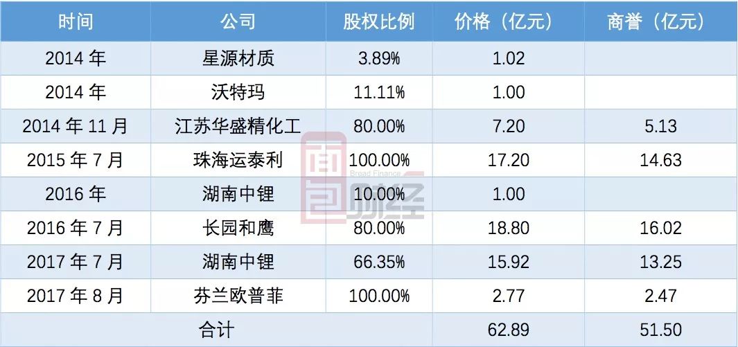 2014年,公司圍繞電動汽車相關材料方面,相繼投資深圳市星源材質科技股份有限公司(星源材質,300568.SZ,2016年12月上市)、收購江蘇華盛精化工股份有限公司80%股權、增資獲得深圳市沃特瑪電池有限公司11.11%股權。