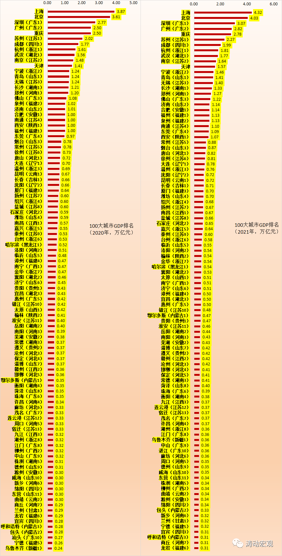 2021年,前100大城市的經濟總量合計達到80.73萬億、前24大城市的經濟總量達到44萬億、前50大城市的經濟總量合計達到61.34萬億。