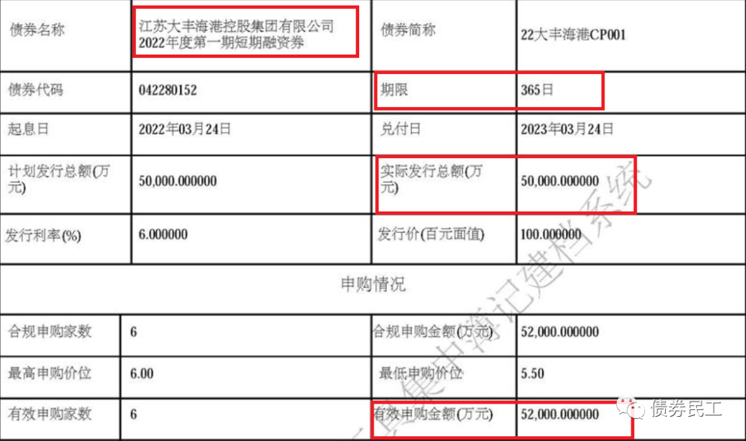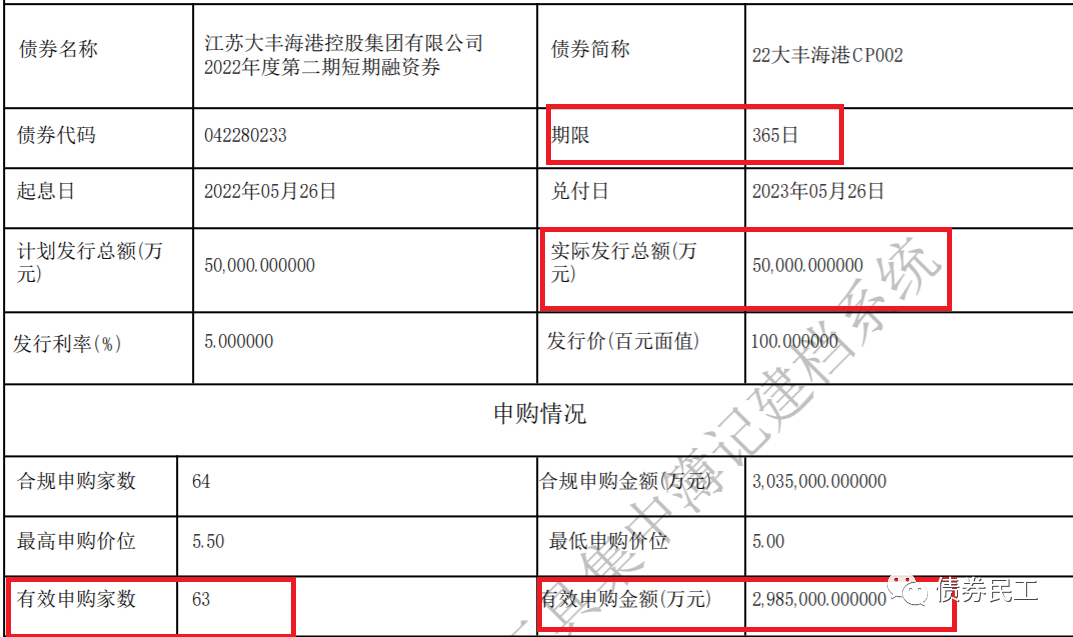 2022年5月25日,江蘇大豐海港控股集團有限公司(以下簡稱“大豐控股”)發(fā)行2022年度第二期短期融資券,發(fā)行金額為5億元,有效申購金額為298.50億元,申購倍數(shù)高達59.7倍!!!這個申購倍數(shù),是債券民工見過的最高的,之前只見過10倍的。“22大豐海港CP002”的債券期限為1年,最終發(fā)行利率為5.0%。