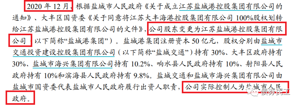 大豐控股的原股東和實際控制人為大豐區(qū)國資委。2020年12月,大豐控股的實際控制法人由大豐區(qū)國資委更為江蘇鹽城港控股集團有限公司,實際控制人由大豐區(qū)國資委變更為鹽城市人民政府。