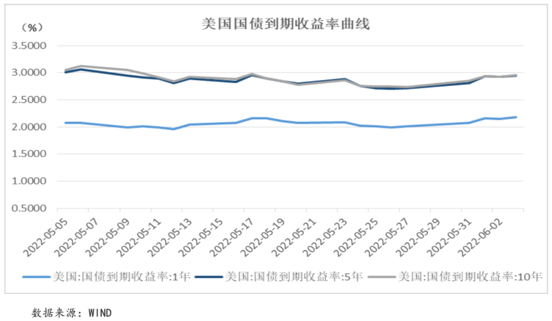 本周,美聯儲理事沃勒“支持加息至中性水平以遏制通脹”的“鷹派”言論以及美聯儲主席鮑威爾在與美國總統拜登會面中再度強調了遏制通脹的緊迫性的論調都為美債收益率上行提供支撐。此外,本周美聯儲正式開啟“縮表”也推動長端收益率上行。具體來看,本周1年期、5年期和10年期美國國債平均收益率較上周全線上漲11.85個BP、15.30個BP和14.55個BP至2.14%、2.91%和2.92%。