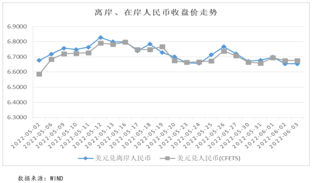 本周,中國疫情好轉,上海宣布全面復工復產,疊加一系列穩經濟的宏觀政策的出臺,中國經濟回暖的預期增強支撐人民幣匯率有所走高。截至周五,美元兌離岸人民幣匯率收于6.6537,周內收跌1.05%;美元兌在岸人民幣匯率收于6.6750,周內收跌0.45%。