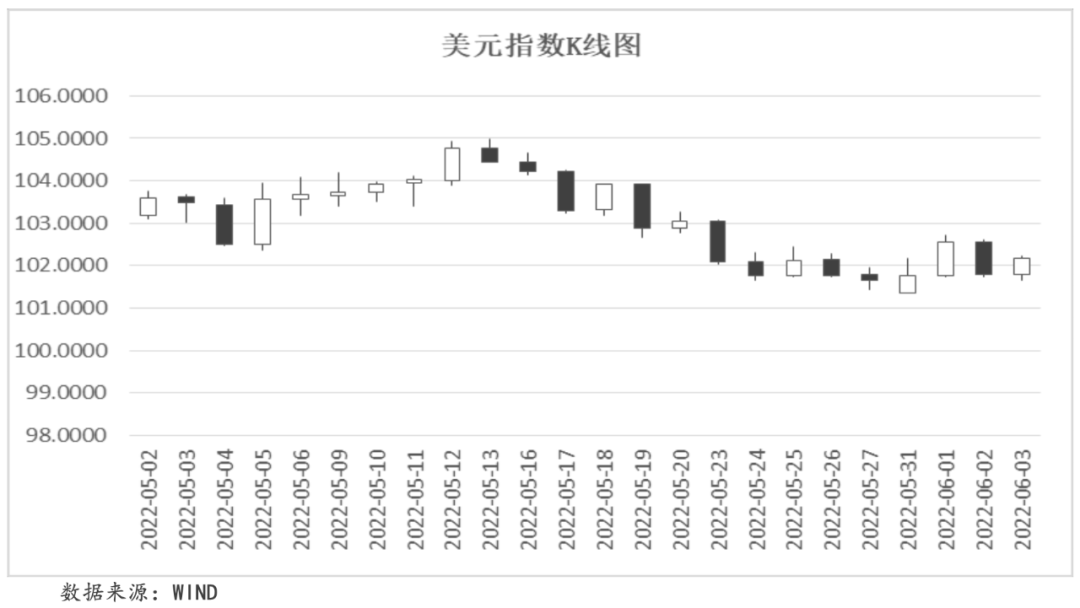 本周,美國經濟數據的超預期走好和美聯儲加息預期的增強都對美元形成一定支撐。周三,美聯儲正式開啟“縮表”及美聯儲官員“鷹派”言論都支撐美元上漲;周四,5月“小非農”數據(ADP就業數據)錄得12.8萬人,不及市場預期的30萬人,對美元造成打壓;周五,非農數據的超預期走好,支撐美元再度上行。截至本周五,美元指數收于102.1704,周內累計收漲0.81%。