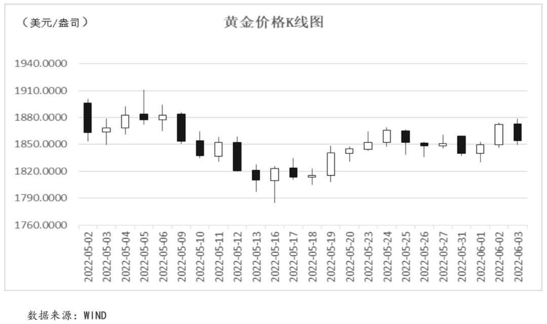 本周,黃金價格在美聯儲官員“鷹派”言論、美國經濟增長前景和就業數據等多方因素的影響下呈現波動走勢。周二,美聯儲官員的“鷹派”言論以及美聯儲主席鮑威爾與美國總統拜登就通脹問題的會面拉升長期美債收益率大幅走高,相應削弱了黃金的吸引力。周四,美國“小非農”數據(ADP就業數據)不及預期,引發市場擔憂情緒,黃金價格出現上漲。周五,美國非農數據超預期走好,顯示勞動力市場依舊強勁,黃金價格受此承壓。截至本周五,COMEX黃金價格收于1853.90美元/盎司,周內累計收跌0.30%。