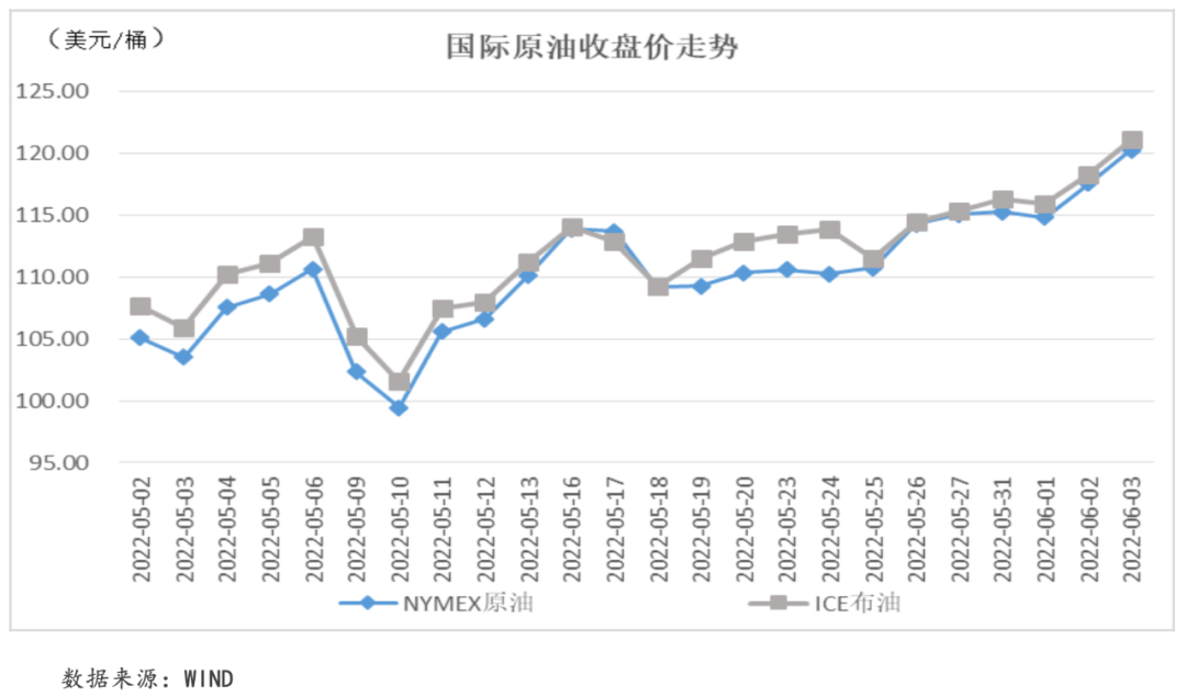 本周,在原油供給前景不確定性上揚的背景下,國際油價一路飆升。具體來看,歐盟正式啟動了對俄羅斯航運石油的制裁,原油市場的供給局勢的不確定性大幅上揚;OPEC+雖松口同意在7月和8月增產,但OPEC+中僅沙特和阿聯酋擁有閑置產能且閑置產能有限,因此市場對于石油供給前景依舊存疑。此外,美國經濟數據的依舊強勁以及中國經濟活動逐步恢復都對于原油價格形成支撐。截至本周五收盤,NYMEX原油價格收于120.26美元/桶,周內累計收漲2.30%;ICE布油價格收于121.08美元/桶,周內累計收漲2.44%。