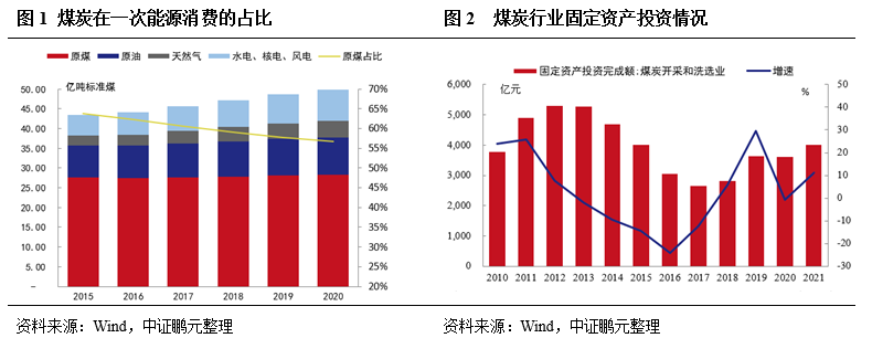 長期來看,雙碳目標下煤炭消費將步入下行周期?!短歼_峰行動方案》中提出“十四五”時期嚴格合理控制煤炭消費增長,“十五五”時期逐步減少,“嚴格控制新增煤電項目、有序淘汰煤電落后產能,推動煤電向基礎保障性和系統調節性電源并重轉型”,政策著力于從煤炭下游需求進行逐步替代。在能源轉型的大背景下,隨著水電、風電、光伏發電等清潔能源機組裝機量的提升,未來煤電機組將主要作為調節性電源的角色發揮調峰功能。中證鵬元預計,在“碳達峰”前后煤炭消費將步入下行周期,其在一次能源消費中的份額將逐漸被新能源所替代。