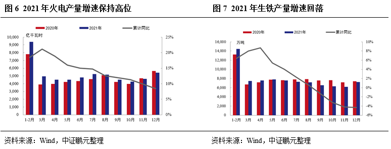 2021年我國經濟繼續復蘇,工業企業生產整體用電負荷高,電廠日耗處于高位,同時下游非電耗煤需求仍有支撐,全年煤炭消費同比增長4.6%。2021年火力發電量增速較快,鋼鐵等非電耗煤需求減弱。電力方面,2021年火電發電量5.77萬億千瓦時,同比增長8.4%,一方面2021年以來我國社會用電量保持較高增速,全社會總用電量為8.32萬億千瓦時,同比增長10.3%。另一方面,受氣候影響,水電發電量全年同比下降2.50%。鋼鐵方面,2021年我國生鐵產量為8.69億噸,同比下降4.3%,6月以來產量低于去年同期。建材方面,2021年全國水泥產量23.63億噸,同比下降1.2%,年內增速由正轉負。