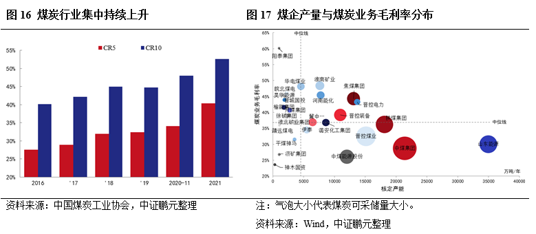 政策推動行業整合加速,預計行業集中度進一步上升。根據《煤炭工業“十四五”結構調整指導意見》,“十四五”期間“推進有條件的煤炭企業跨區域、跨所有制實施兼并重組,爭取在全國形成若干個具有較強國際競爭力的億噸級特大型煤炭企業。”在國企改革提速和煤炭行業供給側結構性改革深化的雙重背景下,煤炭行業兼并重組有望進一步加快。預計煤炭行業CR5、CR10 產量占比將進一步提高,行業集中度將進一步上升。