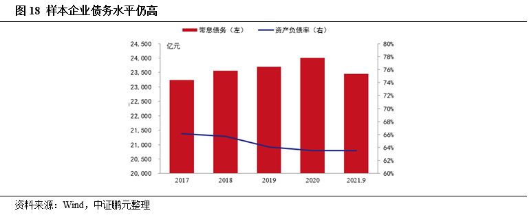 樣本企業資產負債率未有顯著改善,整體仍處于較高水平。截至2021年9月末,樣本企業平均資產負債率為62.71%,較年初下降0.57個百分點。各樣本企業之間資產負債率分化明顯,資產負債率最高值為87.68%,最低值為25.60%。高杠桿企業占比仍較高,資產負債率低于50%的企業共7家,占比19.44%;資產負債率在50%-70%的企業共16家,占比44.44%;資產負債率高于70%的企業共13家,占比36.11%。雖然受益于行業高景氣度,煤企整體盈利狀況較好,但資產負債率未有顯著改善,整體仍處于較高水平。中證鵬元預計中期煤炭價格運行中樞有望較“十三五”期間抬升,需關注在雙碳目標深化前的窗口期下,煤企財務杠桿水平能否出現壓降。