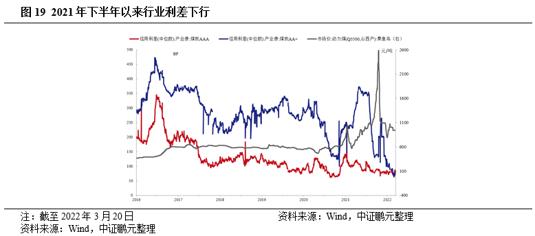 2021年下半年以來煤企信用利差在高景氣度下迅速下行至數年來低位,弱資質煤企信用利差受政策影響波動較大