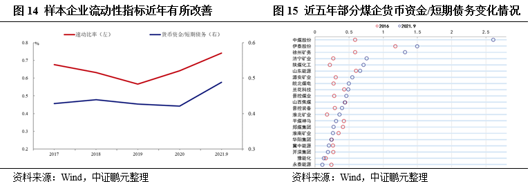 樣本企業流動性指標近期有所改善。截至2021年9月末,樣本企業速動比率和貨幣資金/短期債務中位數分別為0.74和0.49,較2020年末分別上升0.10和0.07,流動性指標邊際改善。截至2021年9月末,速動比率大于1的企業共7家,貨幣資金/短期債務大于1的企業共9家,整體水平仍較低且內部仍有一定分化。中證鵬元預計在短期內行業景氣度維持的情形下,行業流動性壓力邊際緩解,樣本企業短期償債指標將維持小幅改善,但考慮到市場對行業仍存謹慎態度,煤企仍以中短期融資為主,短期償債能力指標仍將維持較弱水平,需繼續關注弱資質煤企的短期償債能力變化。