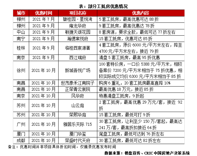 數(shù)量而言,一般單盤的工抵房套數(shù)多數(shù)在10套以下,也有部分樓盤推出20套、30套甚至更多工抵房源,不過這種情況可能為房企變相降價促銷。其優(yōu)惠力度由市場情況,企業(yè)資金缺口、以及供應商、施工方意愿掛鉤。高能級的熱點城市即便有工抵房入市,其價格也相對堅挺,多在9折之上,三四線由于去化壓力更大,折扣力度也相對較大,可以下探突破8折。同樣開發(fā)商若資金壓力較大,為了回籠資金可能會擴大讓利幅度。另外一般情況下,工抵房由開發(fā)商折價抵押給供應商和施工方,若是供應商和施工方希望盡快回款,可能會在原價格基礎上進一步讓利,擴大折扣。