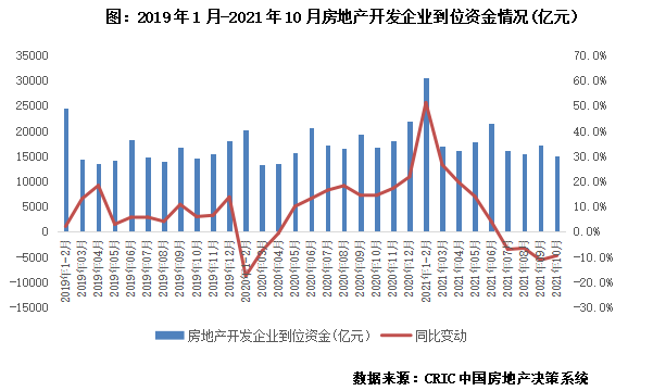 但根據(jù)CRIC監(jiān)測,自9月以來,市場上的“工抵房”數(shù)量激增,主要是有兩個原因:市場轉冷,房企去化不暢甚至庫存積壓,影響企業(yè)回款。根據(jù)CRIC數(shù)據(jù),2021年10月,房地產市場持續(xù)降溫,10月TOP100房企單月操盤業(yè)績規(guī)模同比下降32.2%,自7月以來已經連續(xù)4個月呈現(xiàn)同比下跌的態(tài)勢。調控升級房企融資收緊,發(fā)債受阻,房企開發(fā)到位資金連續(xù)4個月同比下降。從統(tǒng)計局公布的數(shù)據(jù)來看,自2021年7月開始,房地產開發(fā)企業(yè)到位資金總額已經連續(xù)4個月呈現(xiàn)下降趨勢。近3年以來,除疫情期間的2020年1-3月,這一數(shù)值均呈現(xiàn)同比增長趨勢,此番連續(xù)下降,可見房企壓力之大。