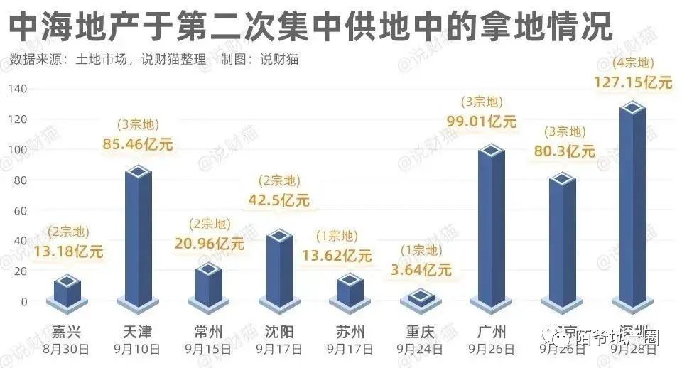 而據統計,僅中海一家,9月以來先后在天津、常州、蘇州、沈陽、重慶、廣州、南京、深圳等地拿下22宗地塊,累計花費超495億元。