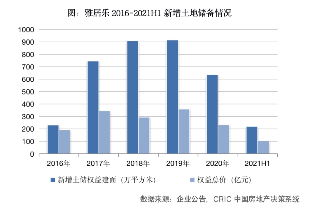 采取審慎的投資態度,拿地銷售比0.29。2021年上半年雅居樂新增22幅土地,新增土儲建面304萬平方米,總地價216億元,對應樓面地價為7109元/平方米。同時新增權益土地建面為220萬方,權益拿地金額105億元。企業保持“拿好地、不拿錯地”的謹慎態度,全口徑拿地銷售金額比為0.29,略低于TOP30房企平均0.31的拿地銷售比。