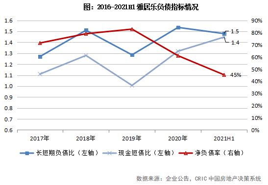 凈負債率持續下降,成功跨入綠檔。2021年中,雅居樂的凈負債率為45.3%,相比于期初大幅下降15.7個百分點,與2019年的82.8%對比,更是實現了兩連降,遠低于行業平均89.1%。此外,剔除預收款后的資產負債率達68.4%,相較期初下降了3.5個百分點,成功跨入綠檔。
